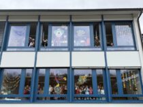 Die 6. Klasse und der Kindergarten gestalten eine fasnächtliche Fensterdekoration.