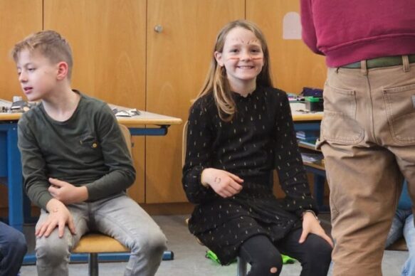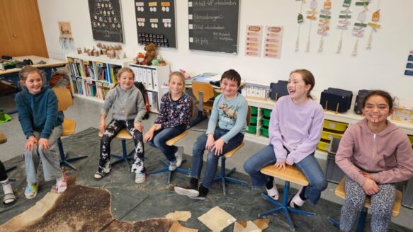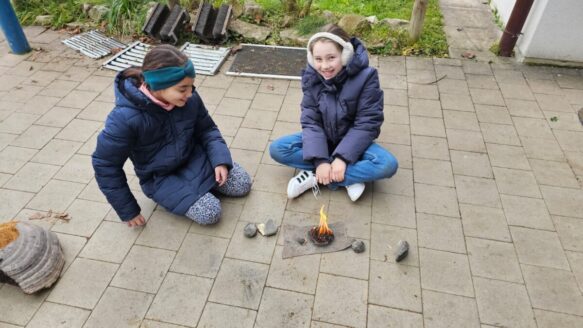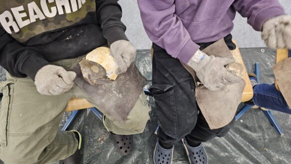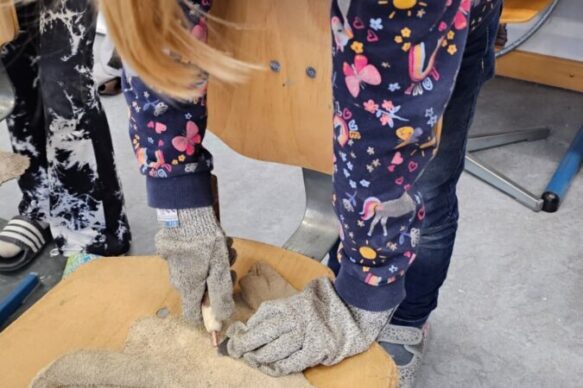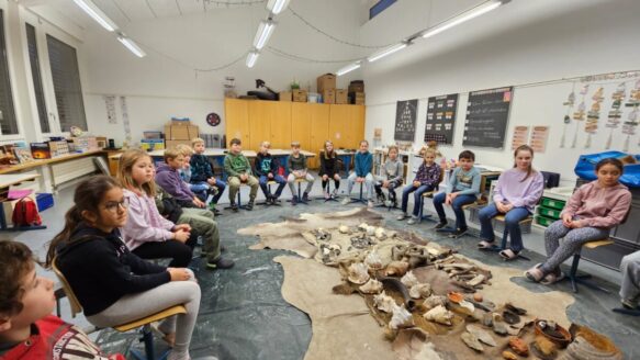 Die dritte Klasse erlebte einen eindrucksvollen Steinzeitworkshop mit Terry Spinelli, der zahlreiche originale Materialien und Nachbildungen aus der Steinzeit mitbrachte. Die Kinder durften diese Gegenstände aus nächster Nähe betrachten und entdeckten viel Spannendes. Anschliessend stellten sie mit Feuerstein und einem Klopfer eigene Werkzeuge her, ganz wie die Menschen in der Steinzeit. Nach der Pause lernten sie, mit Pyrit Feuer zu machen und schabten dafür zunächst Zunder mit ihren selbst gefertigten Werkzeugen. Mit viel Geduld und Geschick gelang es ihnen, durch das Schlagen mit dem Pyrit Funken zu erzeugen und den Zunder zum Glühen zu bringen. Die Glut wurde in Holzwolle übertragen,